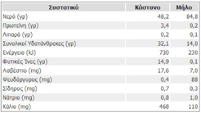 Στον παρακάτω πίνακα συγκρίνεται η θρεπτική αξία του κάστανου με το μήλο.
